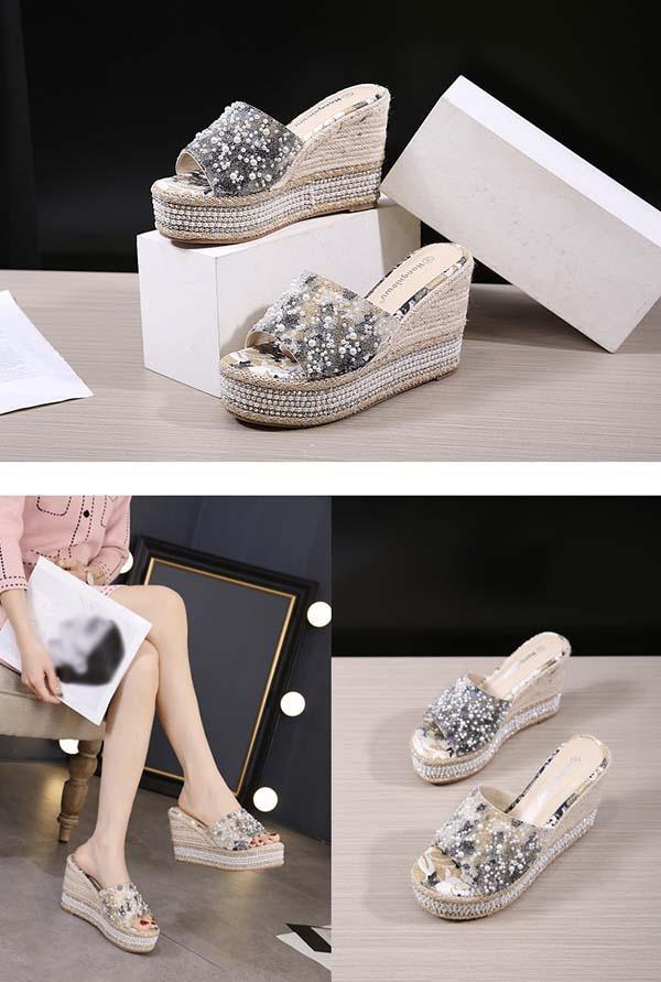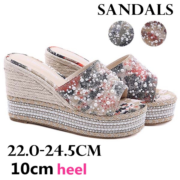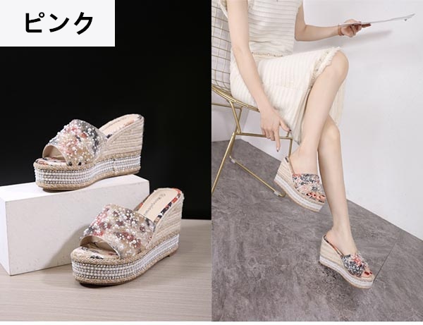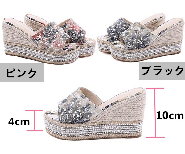 ウェッジソール サンダル レディース 厚底 靴 厚底サンダル ウェッジ オープントゥ 履きやすい 脱ぎやすい ヒール10センチ ミュールサンダル 美脚 大きいサイズ 海 ビーチ プール 旅行 ピンク ブラック かかとなし キラキラ パール付き 22.0/22.5/23.0/23.5/24.0/24.5 di674s1