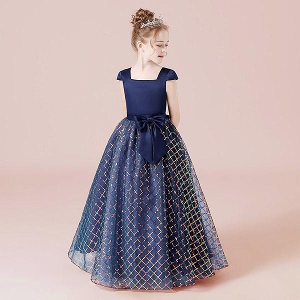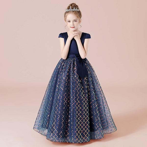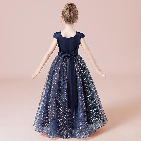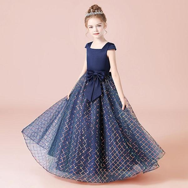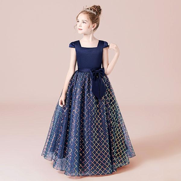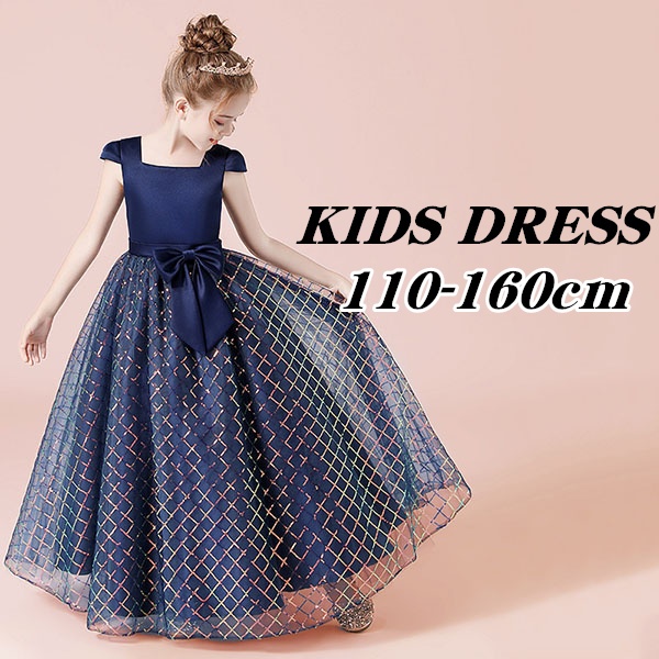 キッズドレス 子供ドレス 160 ピアノ 発表会 子供 ドレス フラワーガール ラウンドネック ロングドレス ちょこっと袖 プリンセスドレス 子どもドレス 袖あり 結婚式 ドレス コンクール フォーマル 七五三 可愛い イベント リボン 上品 お姫様 入園式 パーティー イベント 演劇 学芸会 ネイビー da872s1s1s3