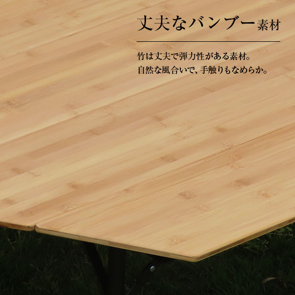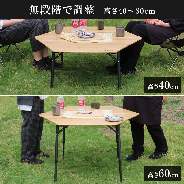 天板は丈夫なバンブー素材で自然な風合い。40〜60cm内を無段階で調節可能。収納バック付きで持ち運びにも便利。