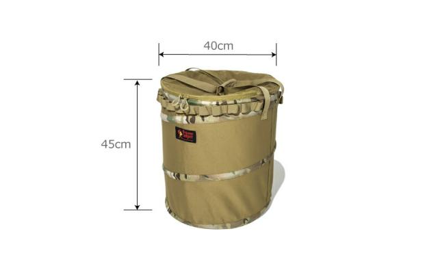 ●ポップアップ(折り畳み)式のトラッシュボックスです。内部にはゴミ袋(45L)をスマートに固定できるスナップボタン、外側には何かと便利なネビュラチェーン付き。