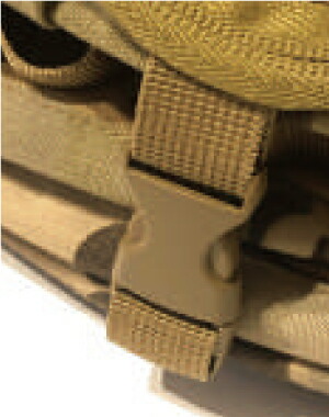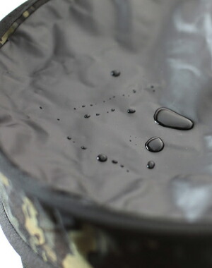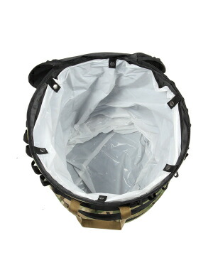 内部にはゴミ袋(45L)を固定できるスナップボタン、外側には何かと便利なネピュラチェーン付き。