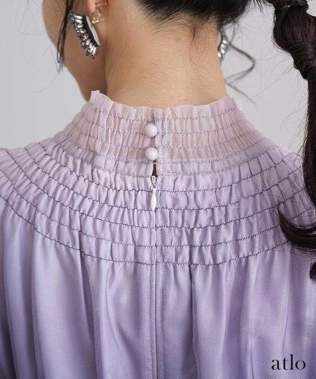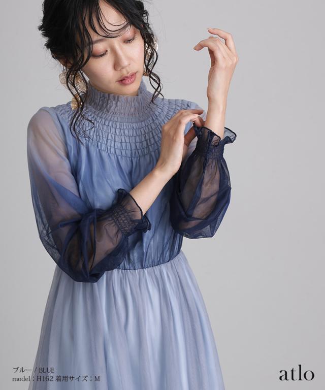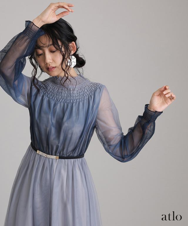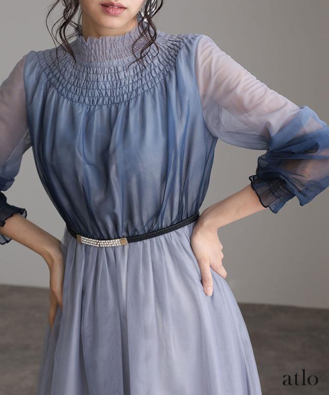 ドレスはハイネックシャーリングゴムが普段使いでも抜け感を持たせ、着回しやすい一枚に。