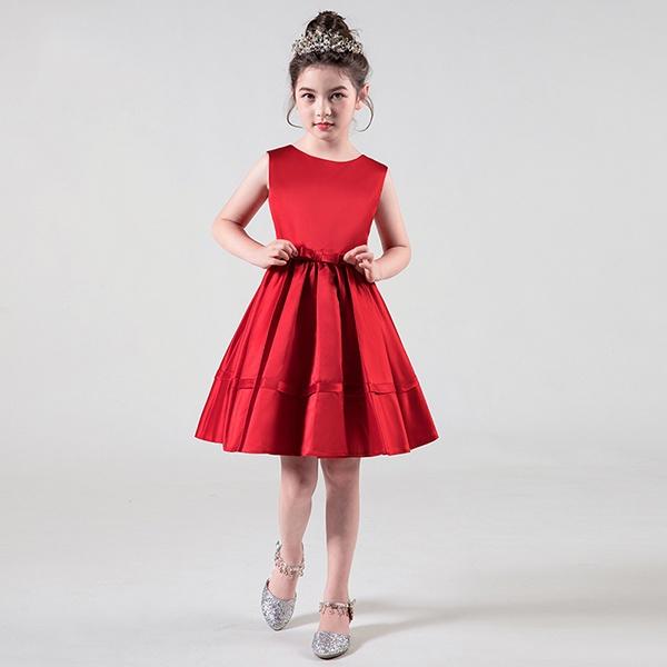 子供ドレス ピアノ発表会 ミディアム丈 Aライン 子供 ドレス 上品 女の子 ビオラバイオリン演奏会 フォーマル キッズ フラワーガール 花嫁付き添い ファスナータイプ レッド ノースリーブ リボン付き ラウンドネック 結婚式 da756s1s1s3