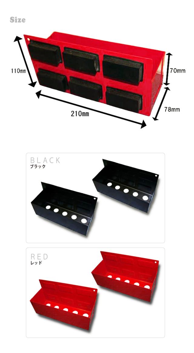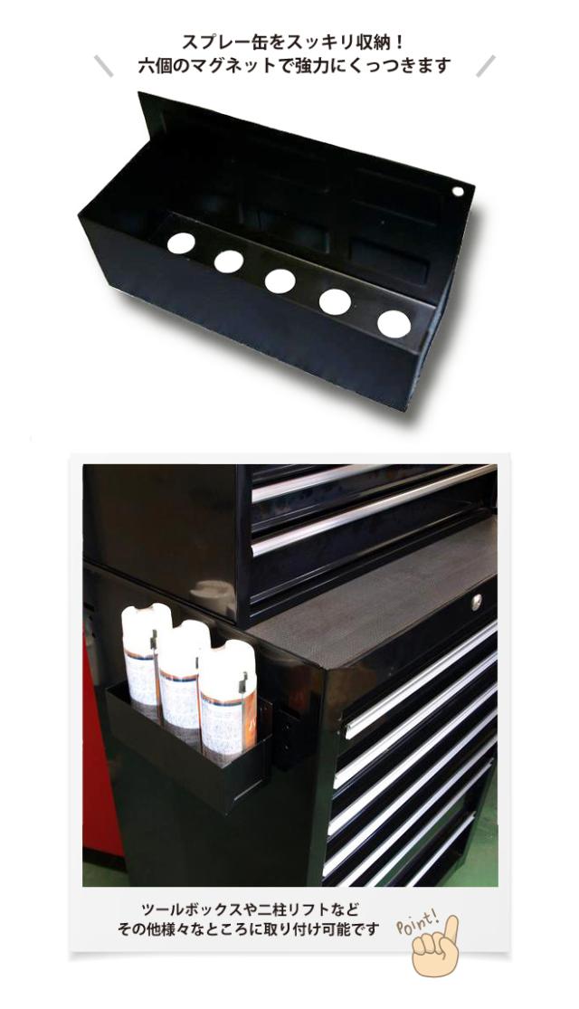 作業性が抜群! ●2個セットでの販売です ●マグネットは表面が樹脂巻きで傷つきを防止します ●6個のマグネットで強力にくっ付きます ●ツールボックスや二柱リフトなど、その他様々なところに取り付け可能です ●カラーはレッド/ブラックよりご選択下さい ☆商品画像のキャビネット工具箱は別売りです ※スプレー缶以外のものには使用しないでください |