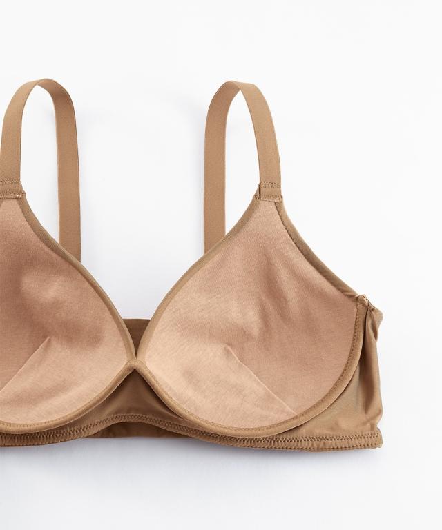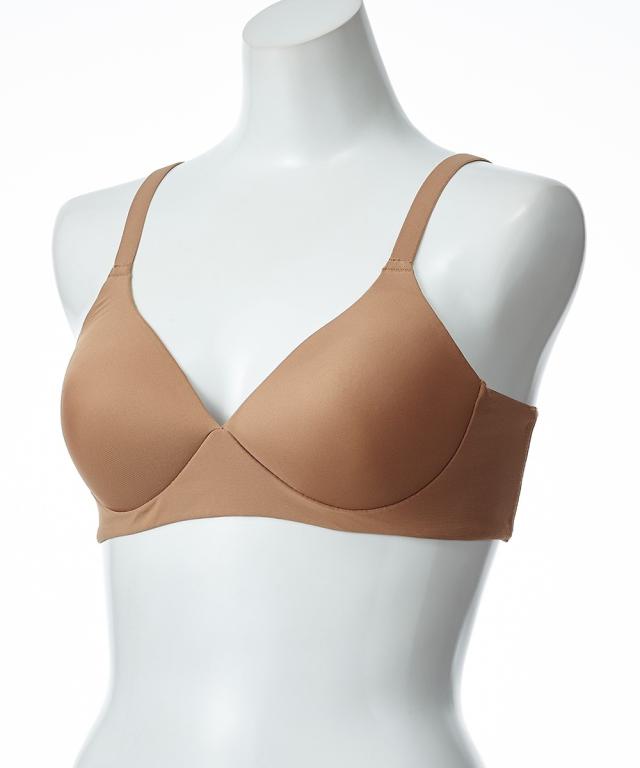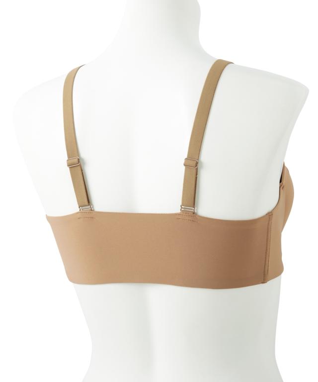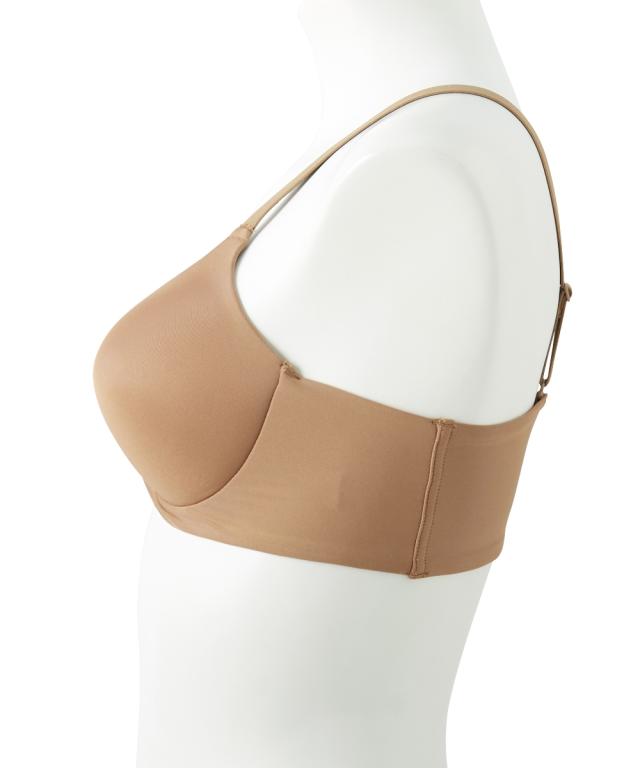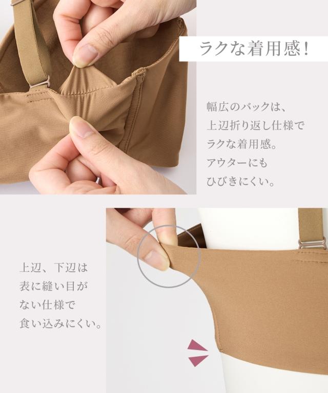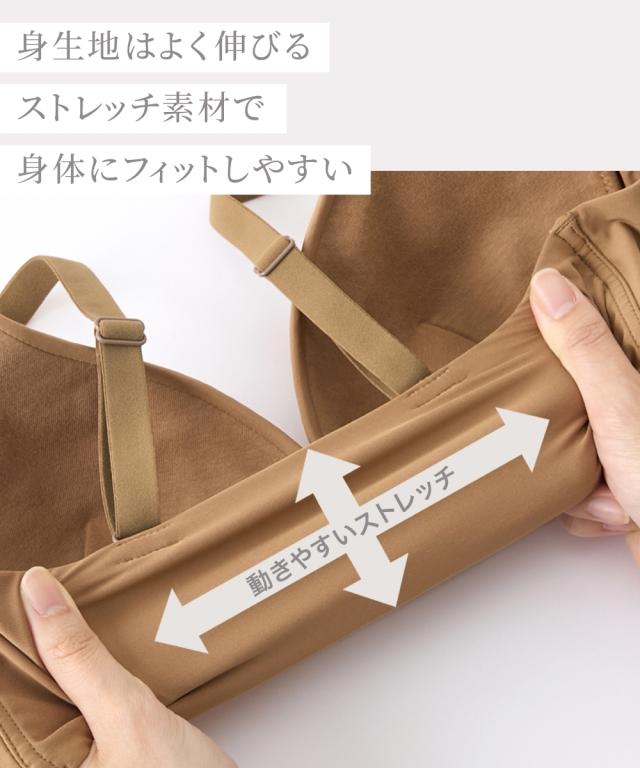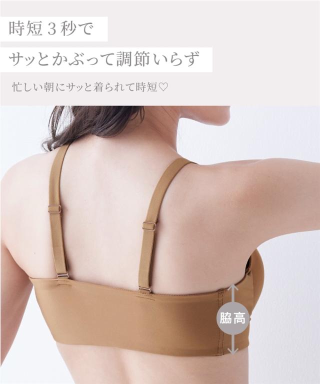 [comment] 超伸縮する肩ひもで長さ調節いらず。アンダーも伸縮するからサッとかぶって即フィット。忙しい朝に手間いらずな時短ブラ。アウターにひびきにくいモールドカップで、ゴムは肌にあたらない仕様。アンダーホックがないので優しい肌あたりです。 カップ部分にシームレスカップを使用しているためアウターに響きにくい