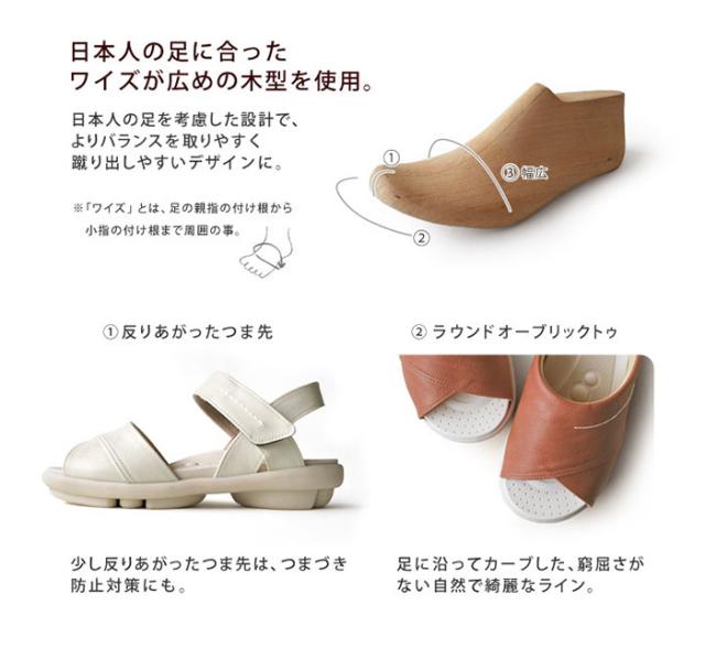 「おしゃれをがんばる女性の休足場所でありたい」という想いから作られたコンフォートシューズで下駄の歩きやすい構造に、イタリア製の洗練されたデザインが落とし込まれています。