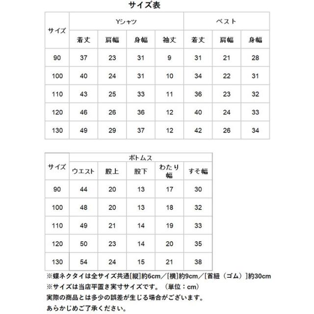 | サイズ | [キッズ] ・90cm ・100cm ・110cm ・120cm ・130cm ※サイズについて詳細は、サイズ表をご覧くださいませ。 ・蝶ネクタイ [縦]約6cm/[横]約cm/[首紐(ゴム)]約30cm ※蝶ネクタイは全サイズ共通です。 |