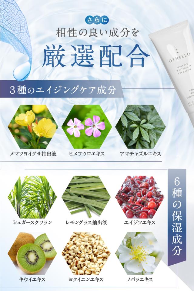 ◆ オセロリンクルホワイトニングアイクリーム(オセロアイクリーム)は、「クマ、目尻・目元の小シワ、たるみが気になる‥」そんなあなたのために、研究開発を重ねて作り上げた美白×エイジンクケアのためのプレミアムアイクリームです。