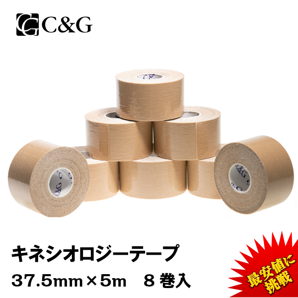 キネシオ テーピング 37.5mm × 5m 8巻入 C&G キネシオロジーテープ キネシオテープ テーピングテープ 送料無料 (本州) マラソン 膝 足首 手首 ふくらはぎ 足裏 指