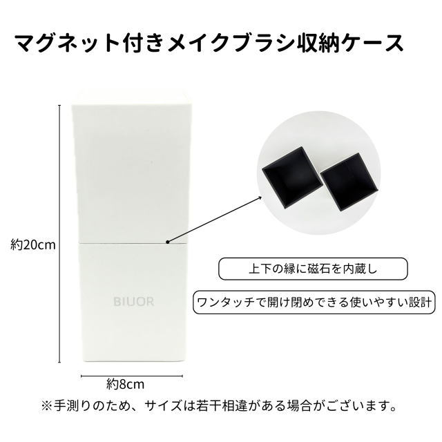 マグネットのついたメイクブラシ収納ケースです。上下蓋の縁口に磁石を入れており、簡単に閉め開けができます。