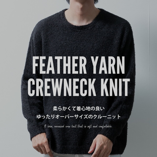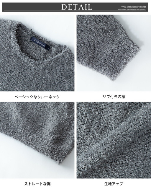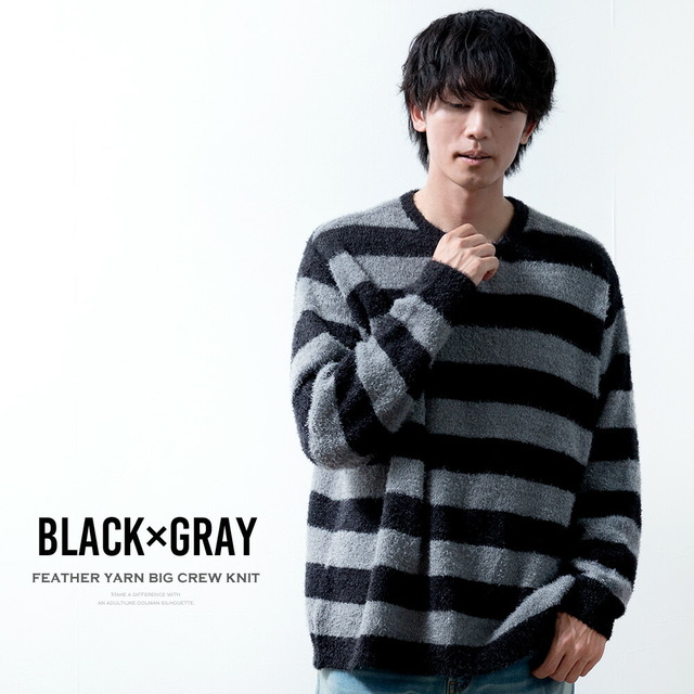 ニット メンズ フェザーヤーン 柔らかい メンズニット 暖かい 秋冬 クルーネック ゆったり セーター トップス カジュアル 無地 オーバーサイズ 全7色 ブラック×グレー