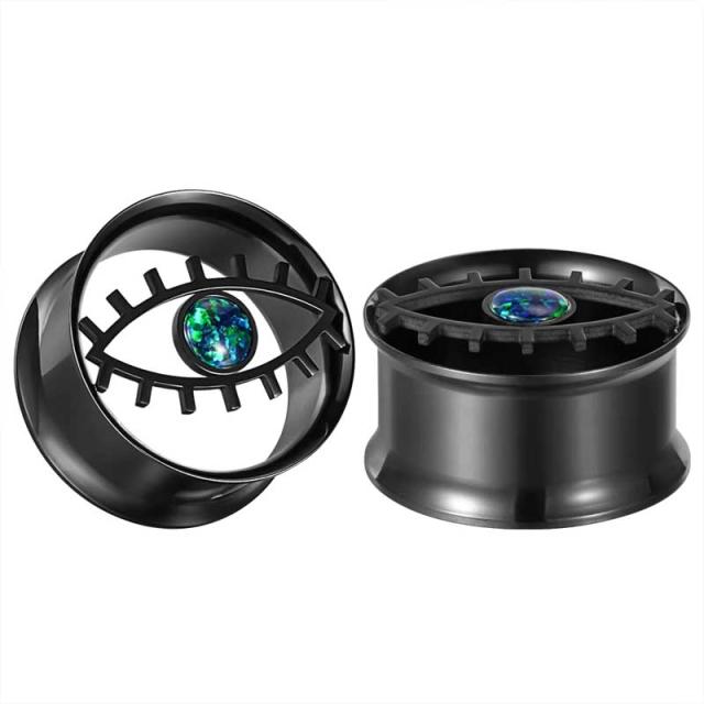 黒色のダブルフレア型のボディピアスに目玉をデザインし真ん中に天然石のオパールを模したイミテーションストーンをセットした高級感のあるボディーピアス。
