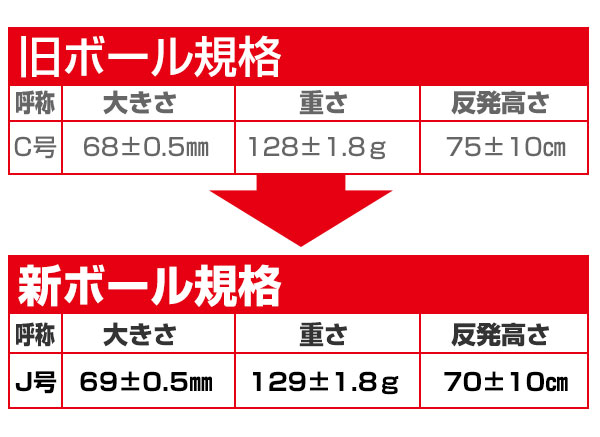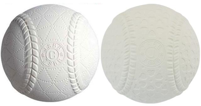 【名称の由来】 ・J=ジュニア、硬球がメインの海外への普及を目指した名称に! 【こんな影響がありそうです】 試合でゴロの軌道がいつもと違う! 従来の軟式球では高いバウンドに対応⇒腰高の守り方でしたが、軟式球のバウンドの高さを抑制したJ号球は硬式野球に近い低くて速い打球が多くなると予想されます。 球速が変わる? ・縫い目の数が変わり、縫い目の形も硬球に近づけたことで、指にかかりやすく、投げやすいので球速が出やすくなりそうです。 【具体的な変更点】 より硬式球に近づく ・表面のくぼみ面積を増やすことで空気抵抗を減らし、変形しにくくすることで、飛距離アップを実現 新軟式野球ボール(J号)と現行の軟式野球ボール(C号)の比較 ・大きさは同じですが、重さが約1g重くなります。 ![]() 【外観】 ![]() 画像左:軟式検定球C号 画像右:軟式検定球J号 表面のくぼみ面積を増やすことで空気抵抗を減少、さらに圧縮荷重を上げて変形エネルギーを押さえたことにより飛距離をアップ 【展開時期】 平成31年度 高円宮賜杯全日本学童軟式野球大会マクドナルドトーナメントより使用予定。 |