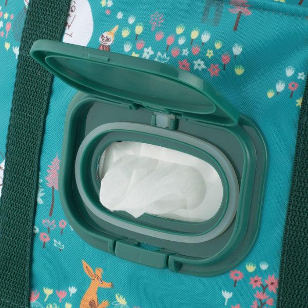 ●ウェットティッシュをバッグに入れたままサッと取り出せる便利なポケットが付いたムーミンのランチバッグです。