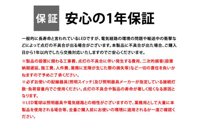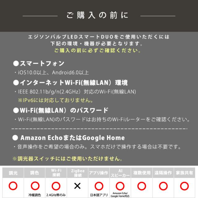 | 備考 | ※壁スイッチなどからのオンオフ操作も可能ではありますが、デバイスがリセット状態に戻る(点滅状態になる)ことがございますので、壁スイッチでの操作はなるべくお控えください。 ※この製品・アプリは日本国内専用です。海外ではご使用になれません。 ※Bluetooth(ブルートゥース)、ZigBee(ジグビー)対応ではありません。 ※交流100V、周波数50/60Hz以外での電源では使用しないでください。 ※電球のみの販売です。その他の器具は別でお買い求めください。 ※調光器スイッチ、断熱材施工器具、密閉型器具には使用しないでください。 ※自動点灯機能付器具、リモコン付の器具等では動作しない可能性がございます。 ※製品の設置に関わる工事費、点灯の不具合に伴い発生する費用、二次的損害(設置納期遅延、施工費、人件費、業務に支障が生じた際の損失等)など一切の責任を負いかねますので予めご了承ください。 その他取扱説明書をよくお読みの上ご使用ください。 |