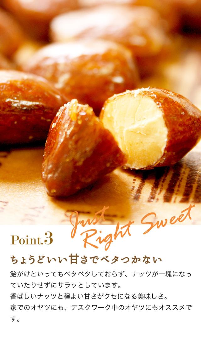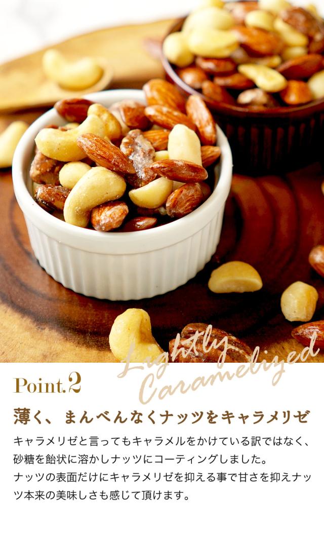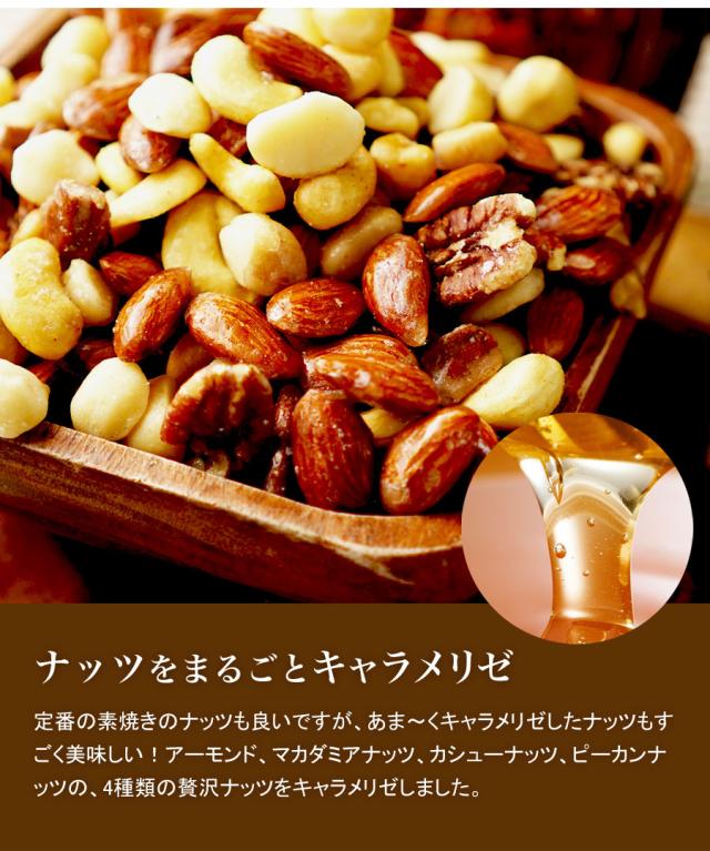- 2度目の購入です!食べ始めたら止まらなくなりそうで、いつも大変です。 いろんなナッツが入っていて、飴の掛かり方も甘すぎず、しつこくなくて、抜群です!
