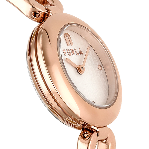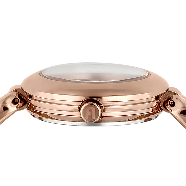 透け感のあるオープンアーチロゴの装飾が腕元をきらびやかに演出。どこから見てもフルラを認識するアイコニックな腕時計です。
