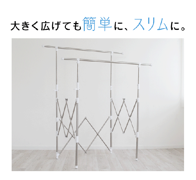 干す量やスペースに合わせて伸縮できる組み立て不要の物干しです。