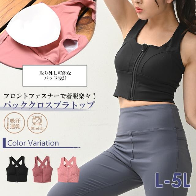 大きいサイズ レディース ブラトップ バッククロス フロントファスナー タンクトップ型 トップス スポーツウェア L/LL/3L/4L/5L ゆったりサイズ ぽっちゃり女子 プラスサイズ メール便送料無料