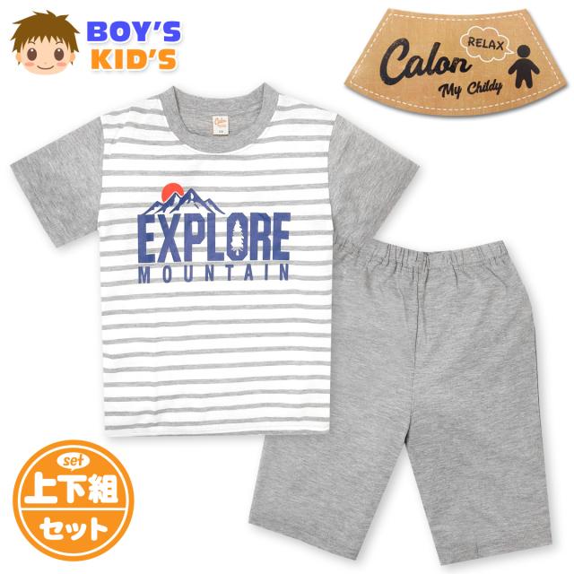 【送料無料】男児 キッズ 綿混 半袖 パジャマ ボーダー柄 ロゴ 上下組 子供服 男の子 120cm 130cm my-0021a【メール便対応】