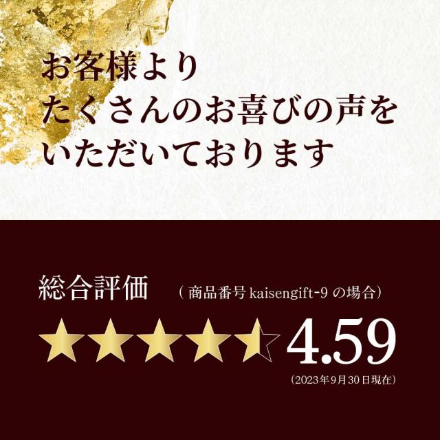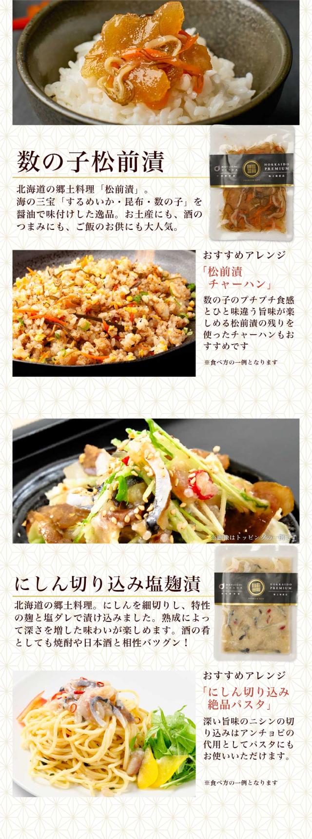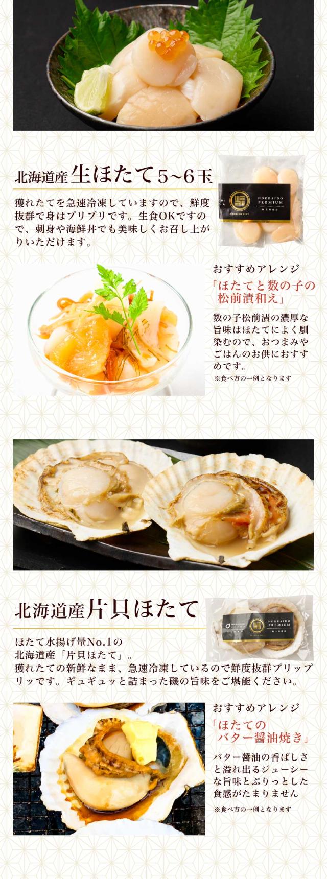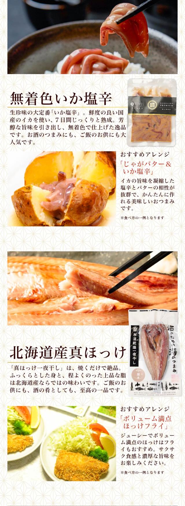 | 内容量 | 1. 北海道産おおずわいがに甲羅盛り 約60g 2. 北海道 海鮮漬け 100g 3. 北海道産 生ほたて 5〜6玉 4. 数の子松前漬け 100g 5. にしん切込み 100g 6. いかの塩辛 100g 7. 北海道産 真ほっけ 干物1尾 8. 北太平洋産 天然紅鮭 1切 9. 北海道産 片貝ほたて 加熱用2枚 |