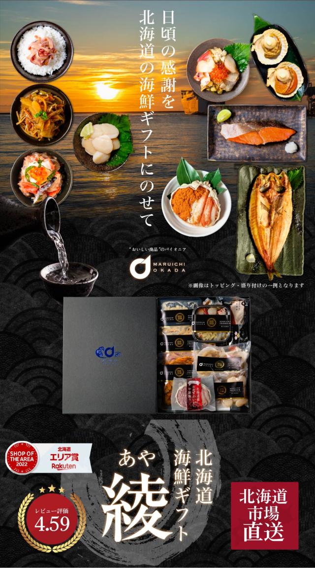 | 商品説明 | 【北海道海鮮ギフト市場直送9点セット『綾』】 札幌中央卸売市場の海の幸をふんだんに詰め合わせました。 大切な方々へのご綾の架け橋としてこの海鮮ギフトをお贈り致します。 贈り物〜プレゼント・内祝い・誕生日・母の日・父の日・お中元・お歳暮・お年賀〜に、もちろん、ご自宅用で美味しい海鮮をお召し上がり頂くのにもオススメです。 北海道から心を込めて、厳選された高品質な原料を使用し、北海道伝統の技術で素材の旨さを引き出した自慢の逸品です。 各品目は個包装されておりますので、とっても便利。また、「解凍して、そのまま」「解凍して、焼くだけ」で美味しくお召し上がり頂けますので、簡単・手間いらずです。 札幌中央卸売市場 自慢の豪華海鮮セット『綾』を、是非ともご賞味ください。 |