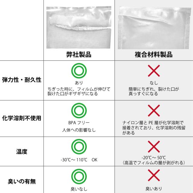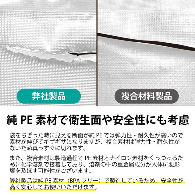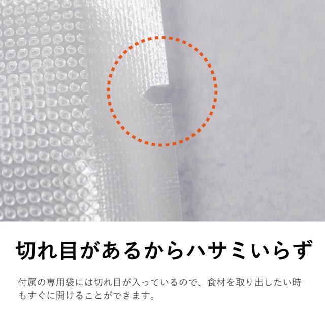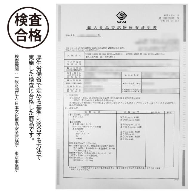 | ・素材:PE樹脂(ポリエチレン) ・サイズ:横 100mm*縦 150mm ・厚さ:片側 約0.09mm ・耐冷温度:-30℃ ・電子レンジ・ボイル:対応可(※) ・パッケージ内容:袋*10枚 ・生産国:中国 ※電子レンジを使用する場合は、袋の破裂を防ぐため必ず袋に穴を開けてください。加熱目安500W:30秒、200W:3分(加熱する場合は少しずつ様子を見ながら行ってください。) ・【切り込みで開けやすい】切れ目があるのでハサミいらず!食材を取り出したいときもすぐに開けることができます。 ・【使い方いろいろ】肉やハンバーグ、魚、かさばる野菜、湿気りやすい乾物、ペットフードの小分け、防災用品の保存など、幅広くご使用いただけます。 ・【空気を吸引しやすいエンボス加工】片面内側は吸引時の空気の流れを最大にするエンボス加工(凹凸)付き!片面はフラットで透明です。 ・【まとめ買いでお得】たくさん使いたい方にうれしいセット商品です。 ・【取扱上の注意】 ・お子さまの手の届かないところに保管してください。 ・尖った形状の物を入れると、材質上破れることがございます。 ・可燃物のため、火や熱源のそばに置かないでください。 ・製品を加工する際に生じるにおいが残っている場合がありますが、 食品衛生上、無害な材質を使用しておりますので、安心してお使いいただけます。 ・オーブンや直火での加熱調理などには使用できません。 ・パック済の袋を電子レンジで温める際は、必ず穴を開けて耐熱容器に乗せてください。穴が空いていない場合は破裂する恐れがございます。 ・スープなどの液体は使用できません。 ・食品を保存する際は、真空パック後、冷蔵庫や冷凍庫に保存してください。 ・この商品はポリエチレン製ですので、燃やしても有害な塩素ガスが発生しません 。 ・この商品は食品衛生法に基づいて制定された「食品添加物などの規格基準」 に適合しています。 【 検査機関について 】 厚生労働省 食品衛生法に基づく登録検査機関:一般財団法人 日本文化用品安全試験所 東京事業所 |