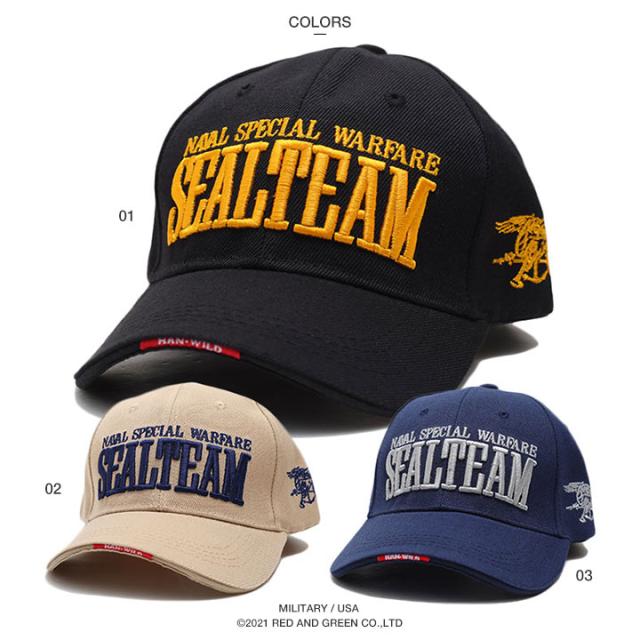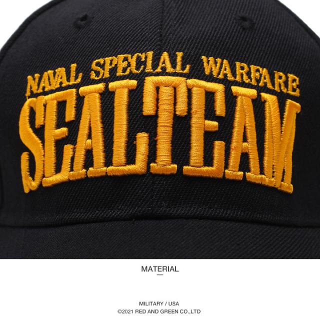 カーブバイザーと浅めのクラウンが特徴的なローキャップを採用し、フロントパネルセンターに3D立体の「SEALTEAM」ロゴ、左サイドに「エンブレム」、バックパネルに「U.S. NAVY」のロゴ刺繍を施したスタイリッシュな仕上がり。