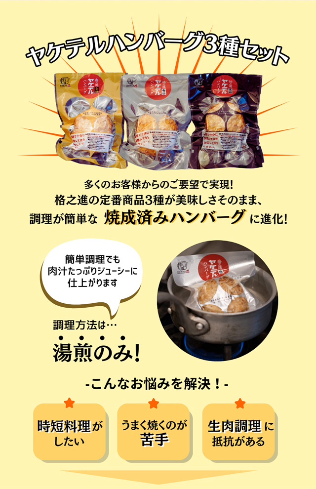 ハンバーグ工場の竣工を記念いたしまして、多くのお客様からご要望をいただいておりました、格之進こだわりのハンバーグの美味しさはそのままに、調理が簡単な焼成済みのハンバーグ「格之進 ヤケテルハンバーグ」がついに正式販売を開始!