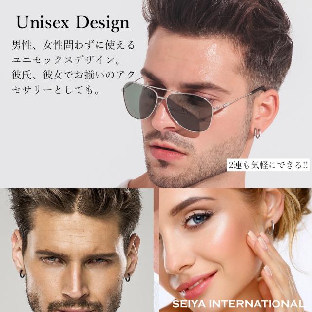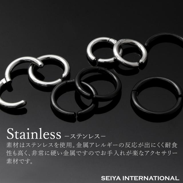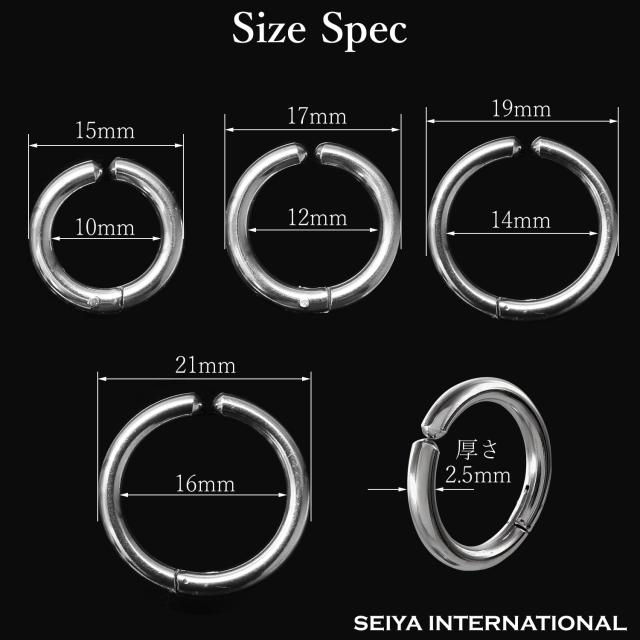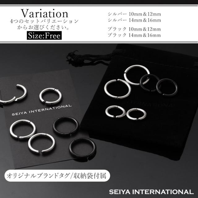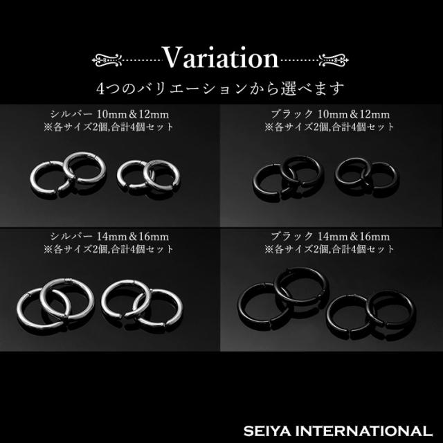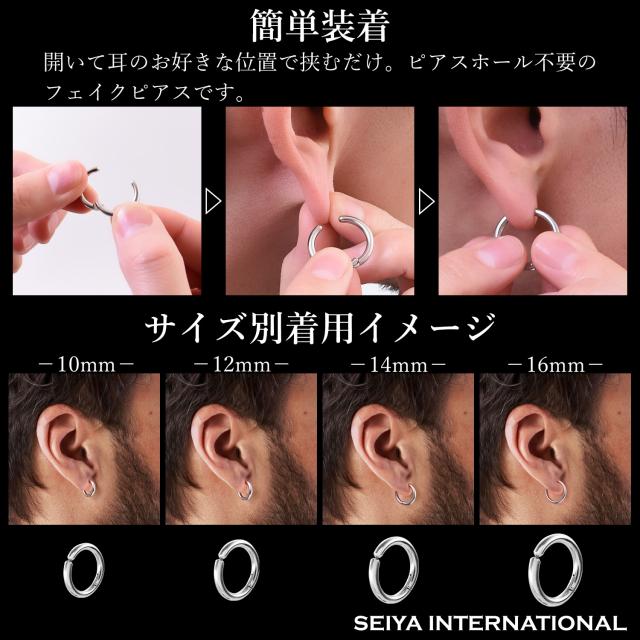 フープイヤリングのサイズは内径10mm・12mm (外径15mm・17mm)のセット 内径 14mm・16mm (外径19mm・21mm)のセット、カラーはシルバー・ブラックの2色をご用意しました。フープイヤリングの厚さは約2.5mmになります。フープのサイズはわっかの直径が大きいほど存在感があり、カジュアルな印象を与えます。シンプルなコーディネートに華やかな雰囲気を加えたい時は、直径の大きなフェイクピアスがおすすめです。一方、わっかの直径が小さいほど上品で落ち着いた印象になります。シックにまとめたい時やビジネススタイルに合わせる時には直径が小さなフェイクピアスがおすすめです。ブラックのフェイクピアスはクールな雰囲気に仕上がります。シルバーのフェイクピアスは、洗練された落ち着きのある印象に仕上げたい時におすすめ。シルバーの輝きはコーディネートをすっきりと魅せてくれます。
