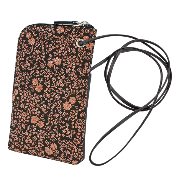 印伝 甲州印伝 印傳屋 上原勇七 スマホポシェット スマホケース 5027 アメリカンブルー 黒地×ピンク漆 鹿革 本革 花柄 ブランド 冬ギフト バレンタイン 贈り物 YM01