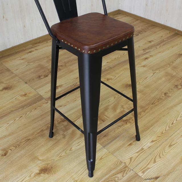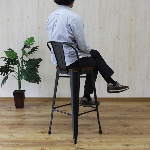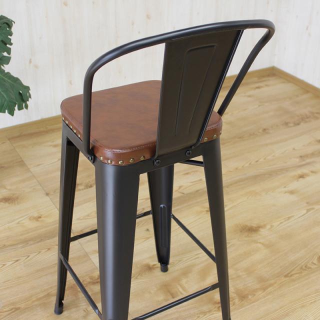 PVCソフトレザーの落ち着いた張地をアクセントとしてブロンズカラーの鋲留めがレトロな雰囲気を演出するバーチェア。