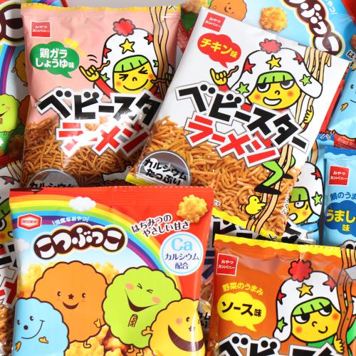 チキン、焼そば、うましお、鶏ガラしょうゆの4つの味が一度に楽しめる「ベビースターいろいろ」と、はちみつのやさしい甘さで次々と手がでるひとくちサイズの揚せん「こつぶっこ」のセットです。食べきり小袋サイズでおすすめです。