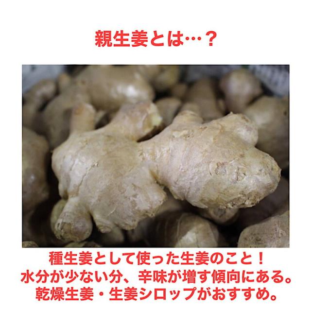 親生姜は、もともと種として昨年使われていたものになります。普通に出回る生姜の親となるのが、この親生姜。通常より水分が少なく、辛みを強く感じます。乾燥生姜や生姜シロップがおすすめ。