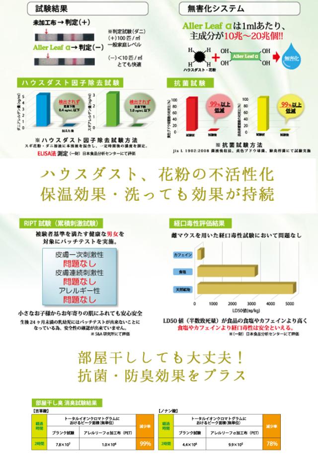 アレルリーフアルファーは、アレル物質を吸着させ除去します。 累積刺激試験で小さい子供から大人までの老若男女を対象にパッチテストをし 安全性もクリアしています。 また、除菌消臭効果もあるので部屋干ししても安心。 洗っても効果持続をします。