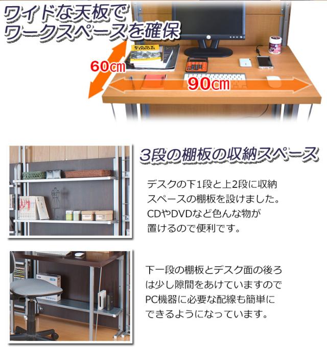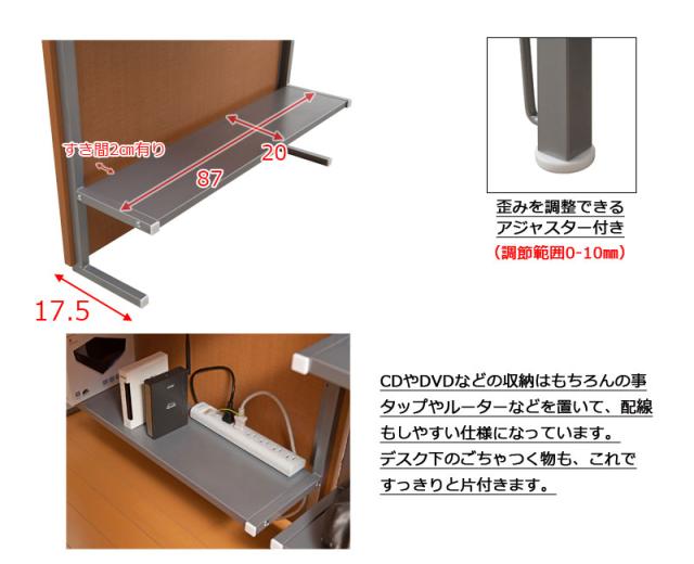 ■商品サイズ/本体:(約)幅90×奥行64.5(脚部17.5)×高さ202〜260cm、棚板:(約)幅87×奥行22(最下段20)cm、棚間隔 :上棚〜中棚(約)33.5、上棚〜デスク面(約)54、デスク面〜下棚(約)47.5cm、デスク面:(約)幅90×奥行60cm、デスク面高:床面より(約)73cm、目隠し部高さ:(約)182cm