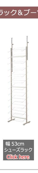 ■商品について/玄関に溢れている靴をしっかり、且つ大量収納でき、玄関のデッドスペースを有効活用できるシューズラックが登場!お気に入りの靴をおしゃれに飾ることで、毎日のお出かけが楽しくなること間違いなし!奥行が22.5cmと省スペース設計でデッドスペースに最適!更に12段あるので収納もしっかり!棚を斜めにすることで奥行をとらず、靴を取り出しやすく、見やすくおしゃれに収納できます。また、ワイヤー式なので靴べらや傘などをかけることができ、とても便利。低めの玄関框をまたいだ状態でも設置できるように微調整可能なアジャスターがついており、更に突っ張り式で安心。安全の日本製。幅29cm・53cm・75cm、幅29cmハイカット・幅53cmハイカットの5種類。玄関だけでなくお部屋にインテリアとしてもディスプレイ感覚でショップ風にキメる!