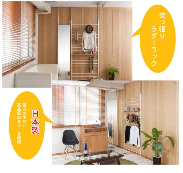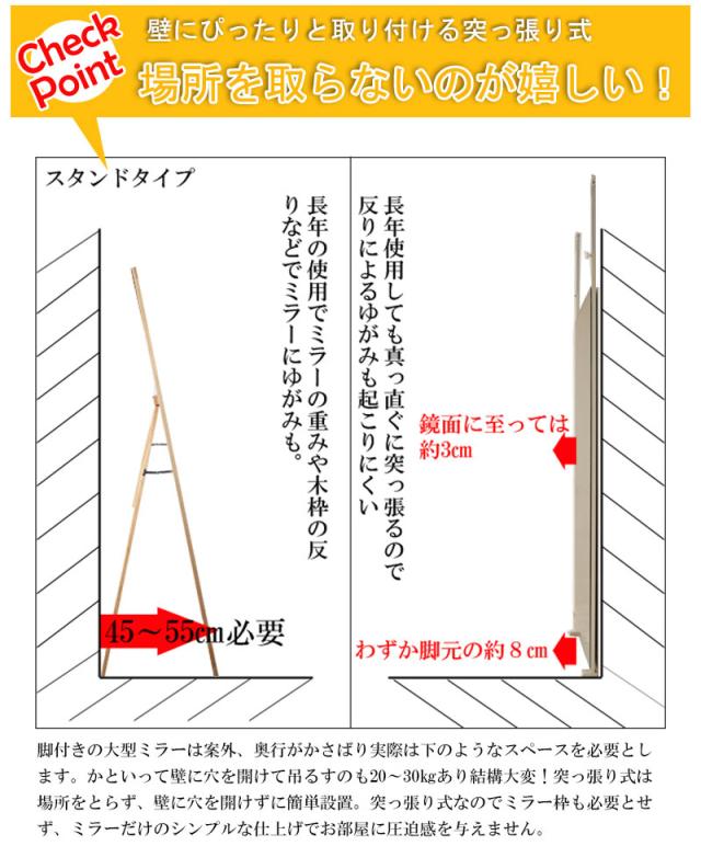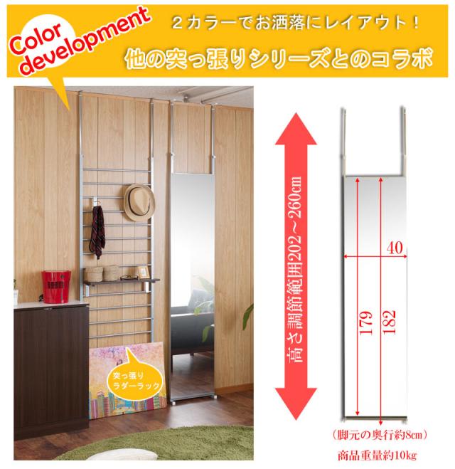 ■商品について/人気の突っ張りミラーシリーズが2色対応&便利な40幅が追加になりバリエーション豊富な全8種展開!幅40は女性や細身の男性の全身がすっぽり収まり、日々のファッションチェックやお風呂上りなどボディチェックに。ちょっとしたすきまスペースにもおさまり、またワイドタイプとの組み合わせであと少し欲しい時にGOODなサイズ感!奥行きいらずの場所を取らない突っ張り式。大型で脚付きのミラーは案外、奥行がかさばり実際はかなりの奥行きと場所を必要とします。かといって壁に穴を開けて吊るすのも20〜30kgあり結構大変!突っ張り式は場所をとらず、壁に穴を開けずに簡単設置。突っ張り式なのでミラー枠も必要とせず、ミラーだけのシンプルな仕上げでお部屋に圧迫感を与えません。
