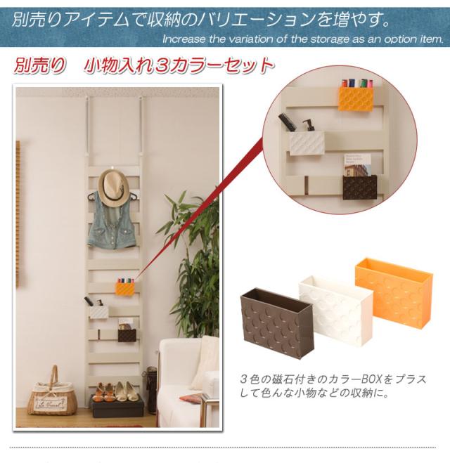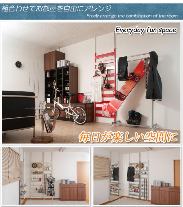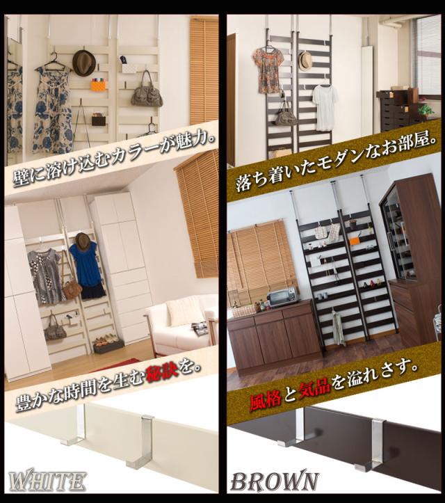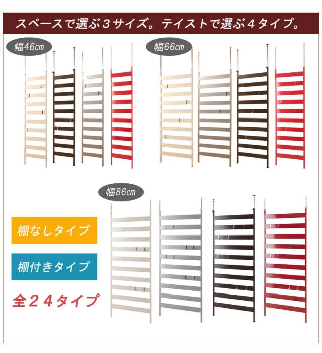 ■商品について/人気の突っ張り壁面ラダーラックがサイズ・カラー全24タイプになって新登場!お部屋に違和感なく馴染む、お洒落なラダーラックで可愛くディスプレイ!!壁に一体化した清潔感あふれるアイボリー系ホワイト、スタイリッシュに飾るならやっぱりシルバー、モダンな雰囲気が大人の落ち着きを与えてくれるブラウン、アクセントが決め手の赤は可愛く飾るのも良し、お洒落に格好良く飾るのも良し、ガーリー系にもマッチング!フック&棚付き、シンプルなフックのみタイプから選べます。フックが8個付きのワイドな86cmラダーに自分流のディスプレイ収納を。