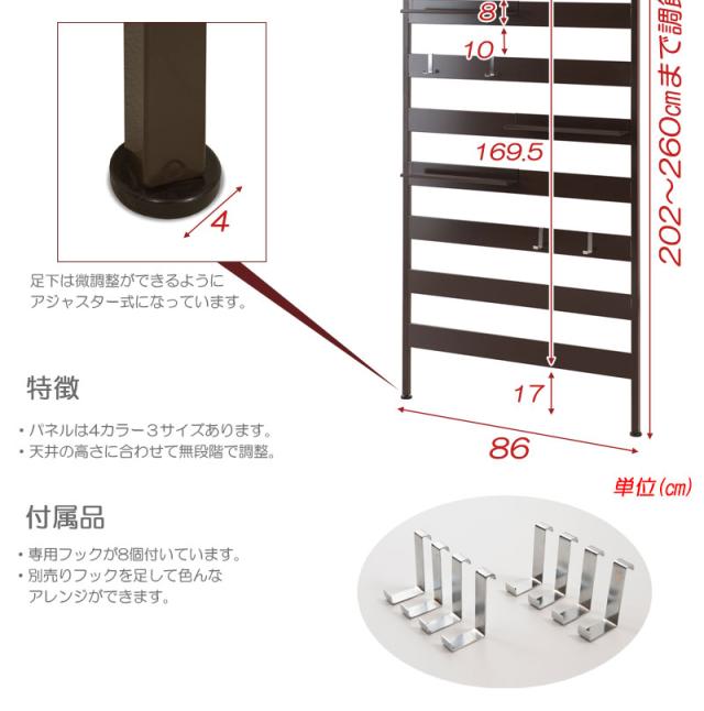 ■商品サイズ/本体(アジャスター含む):(約)幅86×奥行4×高さ202〜260cm、ラダー面下部〜上部高さ:(約)169.5cm、地面〜ラダー下部高さ:(約)17cm、ラダー部高さ:(約)8(ラダー間10)cm