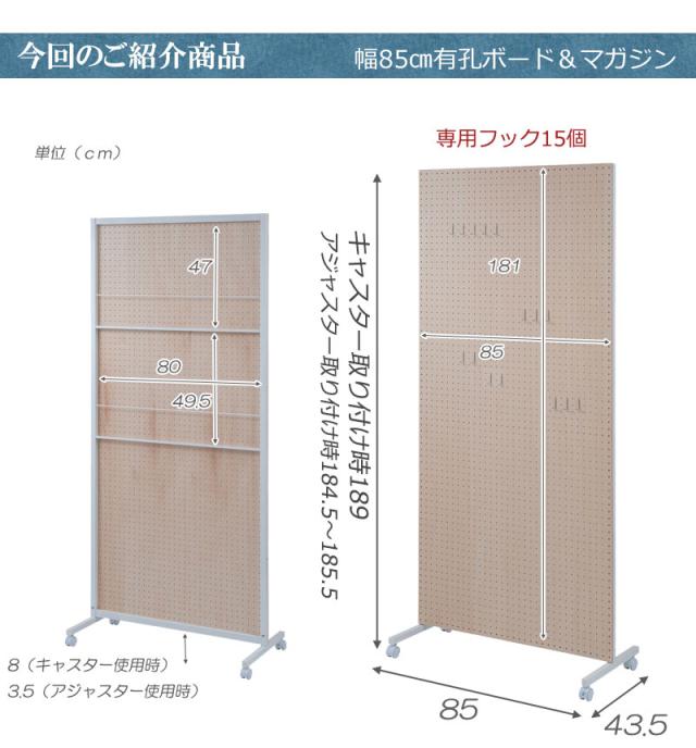 ■商品サイズ/本体:(約)幅85×奥行3(脚部43.5)×高さ(キャスター時189、アジャスター時184.5〜185.5)cm、パネル高さ:(約)181cm、マガジンラック部:(約)幅80×奥行2×高さ(上)47(下)49.5cm、フック出幅(約)3.5cm