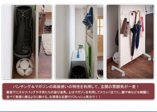 ■商品について/間仕切り有孔ボードタイプのキャスター付きパーテーション。好みの位置に衣類や帽子、カバンなどを掛けたり、裏面は雑誌の収納スタンド付き。ペグボードとしてツール収納にも。様々なシーンで活躍します。同シリーズのミラータイプやパネルタイプと組み合わせてダンススタジオや学校などの活動に。キャスター付きで移動がラクラクで重ねてしまっておける、使い勝手のよいパーテーションです。