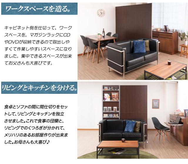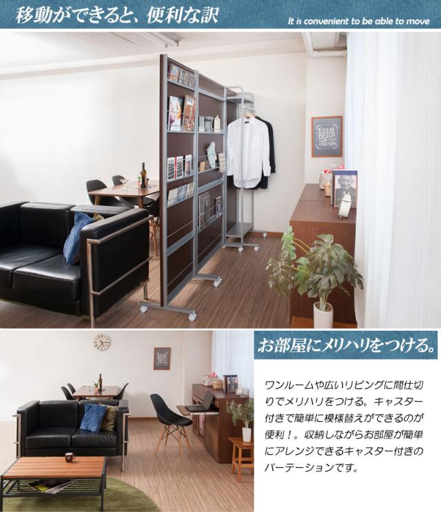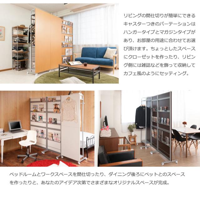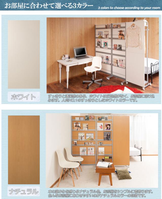 ■商品について/パーテーションを設置するだけで簡単にお部屋を間仕切る事ができます。目隠し部分は清潔感際立つホワイト色、木目の温かみの落着きあるナチュラル色、モダンな印象のダークブラウン。キャスター付きでサッと移動ができて、奥行も薄型で圧迫感がありません。裏側がマガジンラック付きタイプ、棚付きハンガーラックタイプの2タイプ×3色展開。