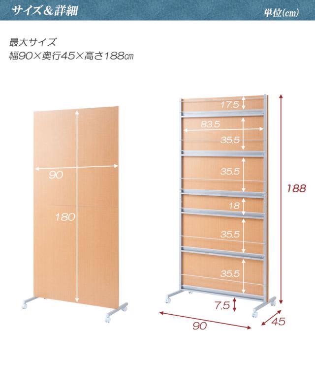 ■商品サイズ/本体:(約)幅90×奥行4.5(脚部45)×高さ188cm、目隠し部高さ(地面より)188cm、ラック部:(約)幅83.5×奥行2×高さ(上から)17.5・35.5・35.5・18・35.5・35.5cm