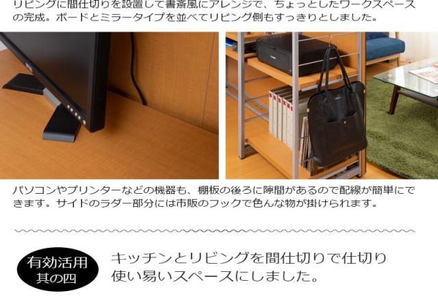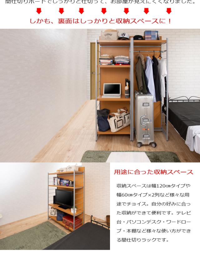 ■商品について/頑丈設計の間仕切りラックシリーズ。棚板厚のボリュームアップにより強度も備えた収納面に間仕切り面はすっきりとした木目調から清潔感あるホワイト色の3カラー展開。収納面はハンガーラックと4段棚の2タイプに、間仕切り面はボードと全身ミラーの2タイプをご用意。オフィスでの使用はもちろん、ご家庭でも間仕切りプラス収納で使い勝手のよいパーテーションです。ミラータイプはダンススタジオやヨガスタジオ、ダンスレッスンなどにも重宝。充実した収納&頑丈がポイント。