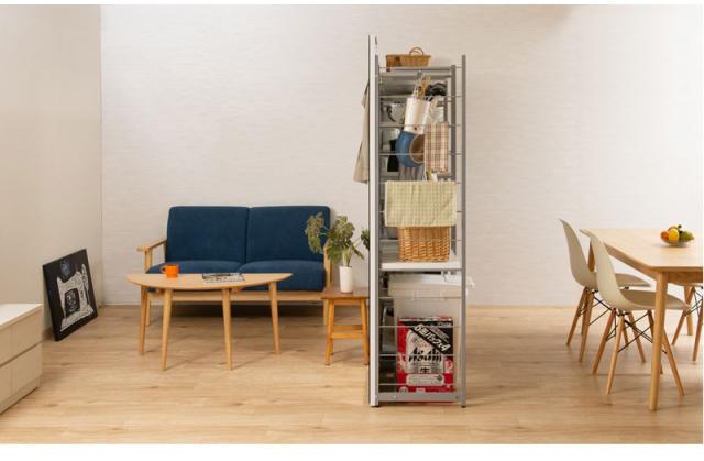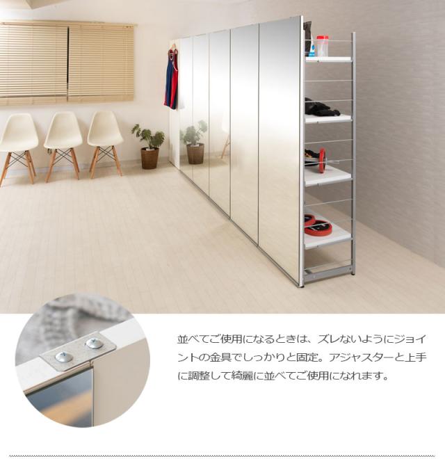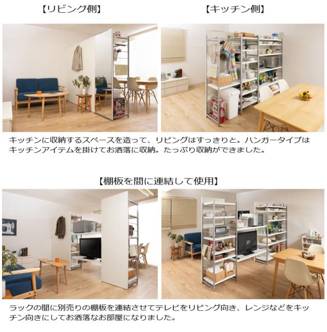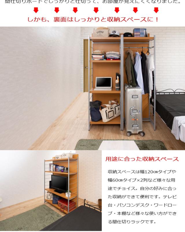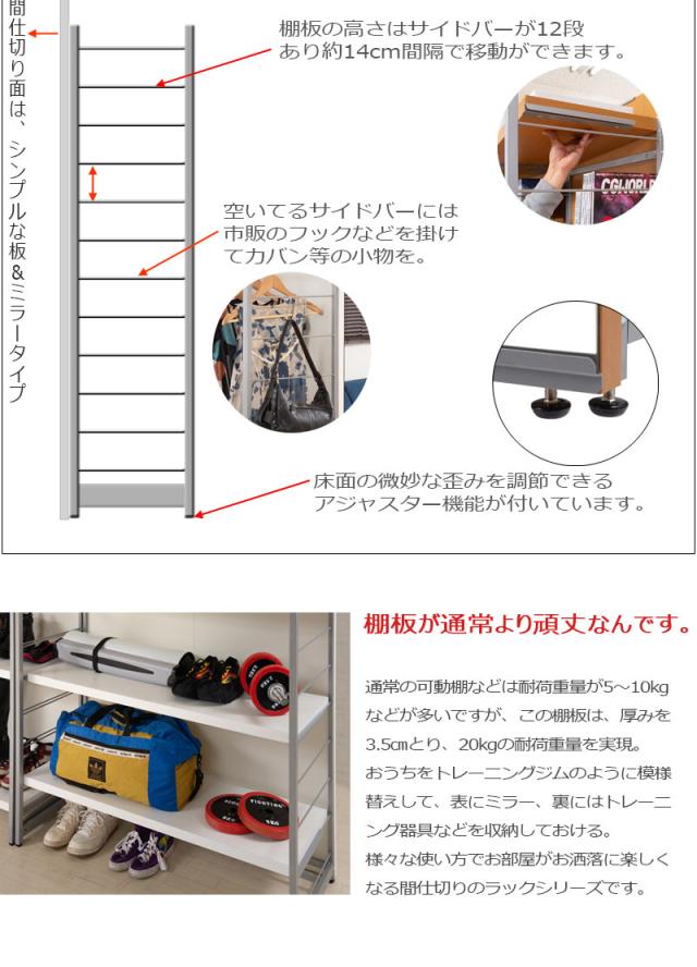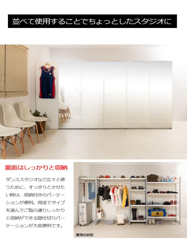 ■商品について/頑丈設計の間仕切りラックシリーズ。棚板厚のボリュームアップにより強度も備えた収納面に間仕切り面はすっきりとした木目調から清潔感あるホワイト色の3カラー展開。収納面はハンガーラックと4段棚の2タイプに、間仕切り面はボードと全身ミラーの2タイプをご用意。オフィスでの使用はもちろん、ご家庭でも間仕切りプラス収納で使い勝手のよいパーテーションです。ミラータイプはダンススタジオやヨガスタジオ、ダンスレッスンなどにも重宝。充実した収納&頑丈がポイント。