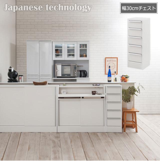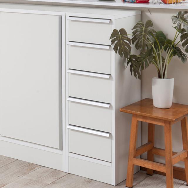 ■商品について/シンプルに仕上げたスタイリッシュシリーズ。細かく分かれた5杯の引出しが色んな小物を小分けして整理ができます。幅も約30cmとスリムでちょっとしたデッドスペースに置けます。他のシリーズと合わせて、キッチンやリビングなどでお洒落に収納できます。引出しを開閉する取っ手は、横に伸びた、シルバー色取っ手が付いています。明るいホワイトにアクセントの利いた取っ手が目立たずに高級感を引き出しています。しっかりとした造りで使いやすい仕様になっています。