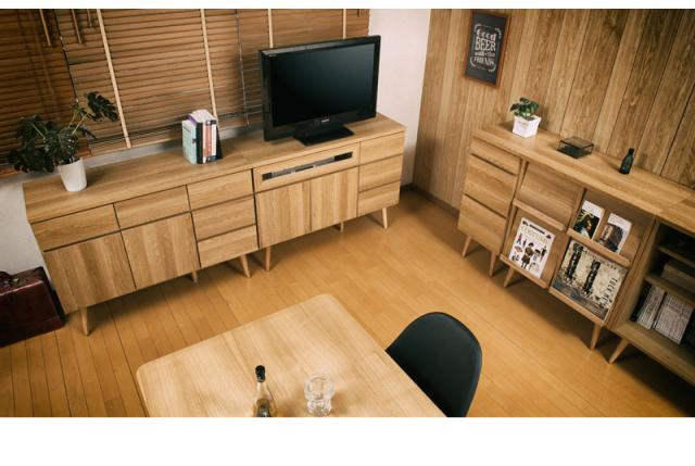 ■商品について/小ぶりでありながら、存在感があるのは脚のシャープ感と本体のボリュームが生む絶妙なバランス。軽やかな印象の小ぶり感はいろいろなタイプと組み合わせてお洒落な雑貨が映える空間を演出。この「バランス」がどこか新しさを感じる、ずっと眺めていたいそんな気持ちにさせてくれる。テレビキャビネットはリビングダイニングでソファからでも見やすいミドル高さに設定。ボードとしてリビングのあらゆるものをしまっておくのに大活躍。取っ手のないプッシュ式扉がすっきりとデザイン性もアップ。掃除も楽な高めの脚付きで、おしゃれ。