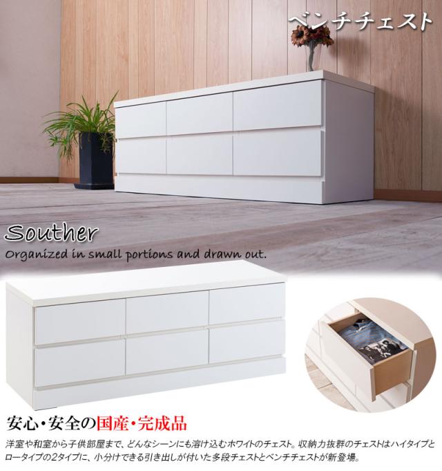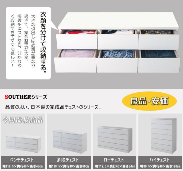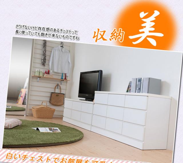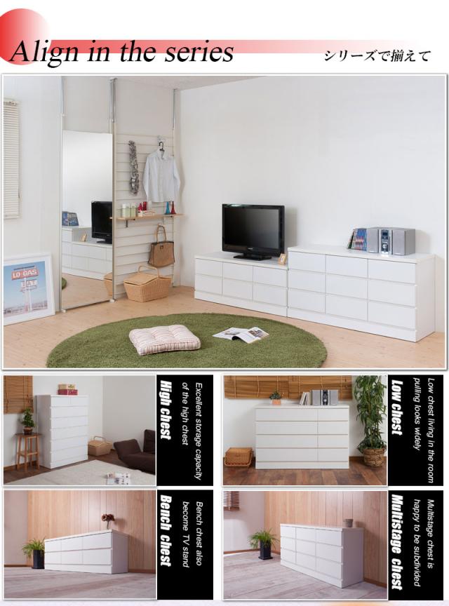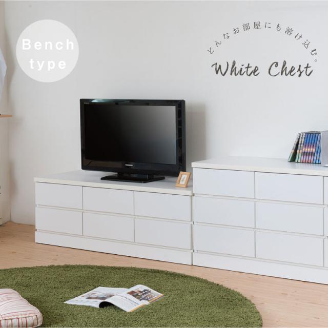■商品について/洋室や和室から子供部屋まで、どんなシーンにも溶け込むホワイトのチェスト。収納力抜群のチェストはハイ・ロータイプの2タイプに、ブロックデザインの小分けできる多段タイプとベンチ型タイプが新登場!スタンダードなハイ・ロータイプと違い季節に合わせた収納や家族の衣類を小分けでき、重ばらず使いやすい。使い方で様々なシーンに活躍します。引出しの間には全段地板入りで強度も◎。シンプルなデザイン&機能的で長く使って頂けます。低めの設計で寝室やリビングでのTV台としても、ランドリーで着替えや下着収納としても、大活躍。真っ白のチェストは圧迫感なくそれでいて存在感のあるGOODなチェストです。■商品の仕様/前板:強化プリント紙化粧繊維板、その他:プリント紙化粧繊維板