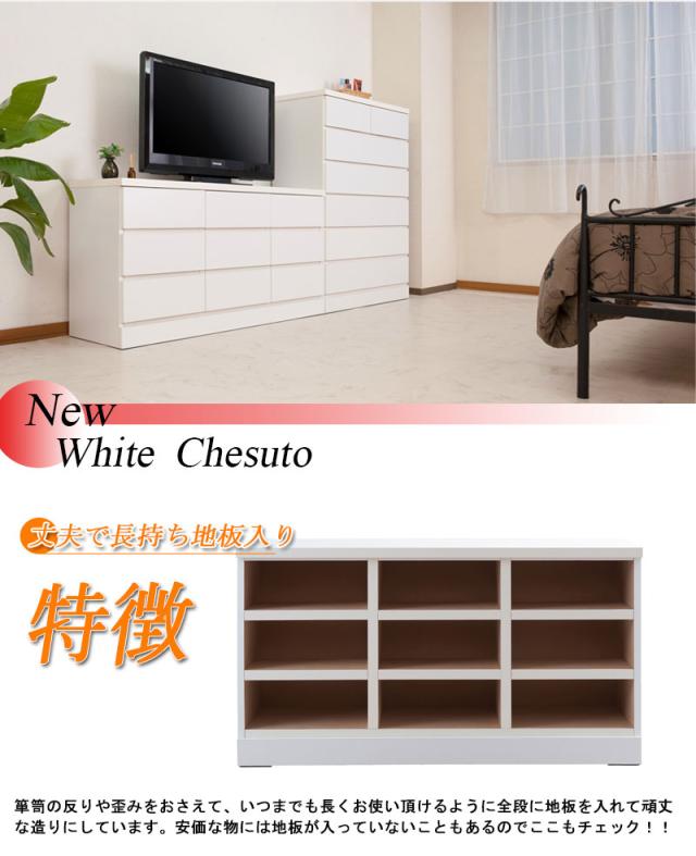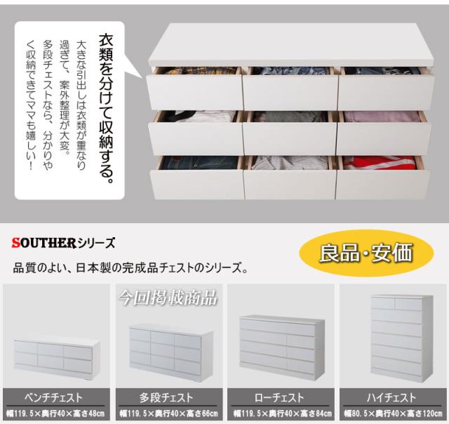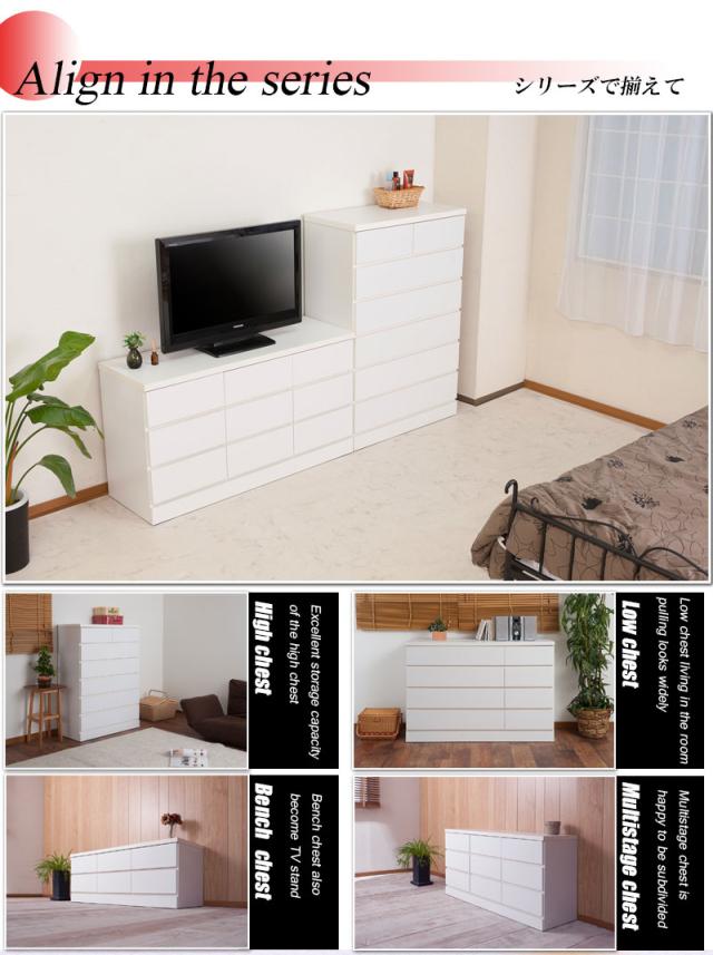 ■商品について/洋室や和室から子供部屋まで、どんなシーンにも溶け込むホワイトのチェスト。収納力抜群のチェストはハイ・ロータイプの2タイプに、ブロックデザインの小分けできる多段タイプとベンチ型タイプが新登場!スタンダードなハイ・ロータイプと違い季節に合わせた収納や家族の衣類を小分けでき、重ばらず使いやすい。使い方で様々なシーンに活躍します。引出しの間には全段地板入りで強度も◎。シンプルなデザイン&機能的で長く使って頂けます。低めの設計で寝室やリビングでのTV台としても、ランドリーで着替えや下着収納としても、大活躍。真っ白のチェストは圧迫感なくそれでいて存在感のあるGOODなチェストです。■商品の仕様/前板:強化プリント紙化粧繊維板、その他:プリント紙化粧繊維板